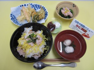 12月特別メニュー 12月の特別メニューは、患者さんへの嗜好調査でも上位の、ちらし寿司と天ぷらの組み合わせです。かにづくしのメニューは、普段は小食な患者さんにも沢山召し上がって頂けました。お粥の方の、かに雑炊も好評でした。