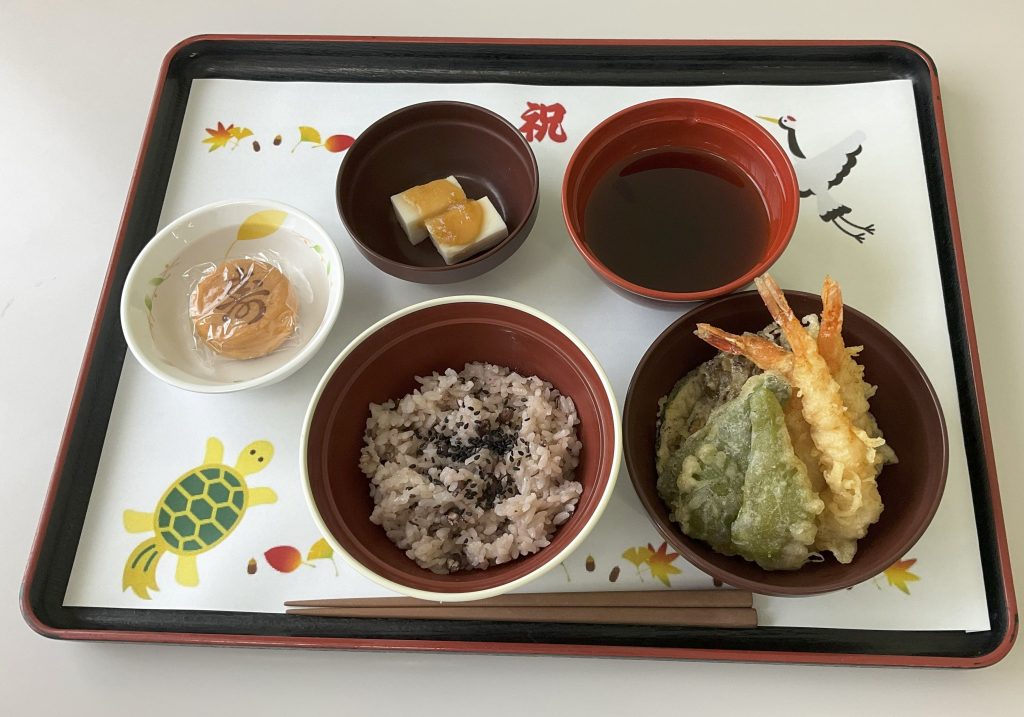 献立は赤飯・天ぷら・胡麻豆腐・お祝い饅頭。